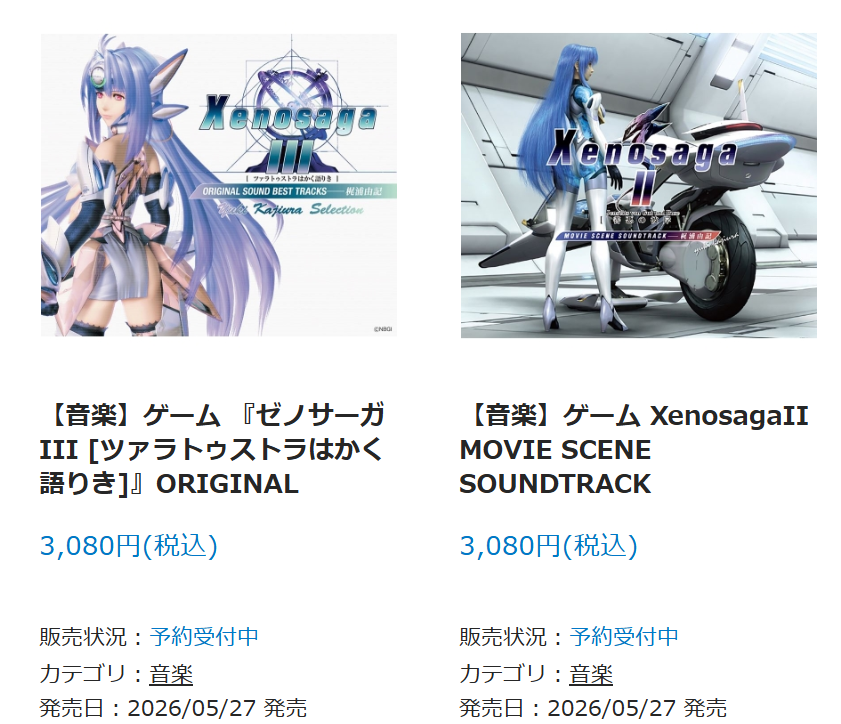 | … | 182無念Nameとしあき26/04/03(金)11:42:23No.1398233710+ 1775184143442.png-(437371 B) ゼノサーガのサントラがなぜか再販 |