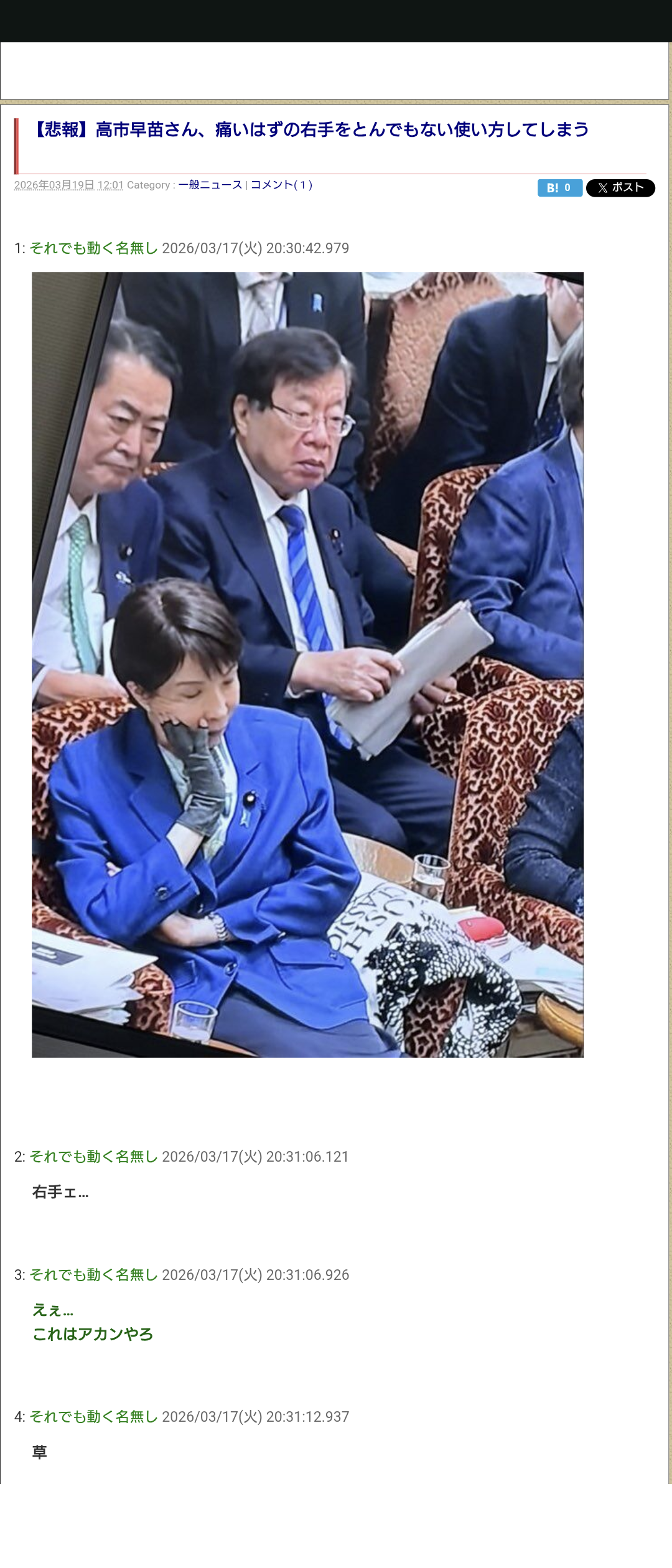 | … | 101無念Nameとしあき26/04/03(金)11:29:30No.1398232117そうだねx1>国会中継で久々に高市の答弁見たけど |