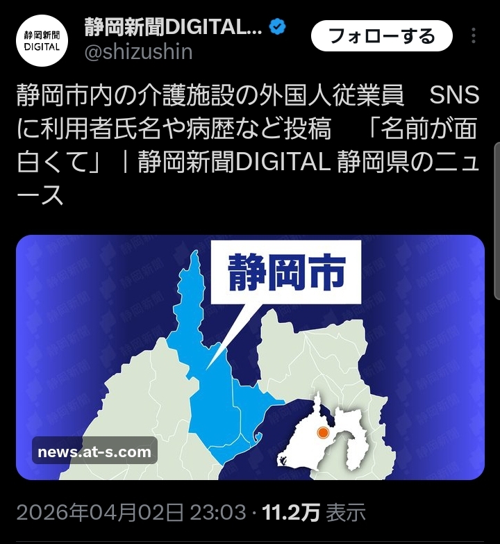 | … | 10無念Nameとしあき26/04/03(金)10:24:02No.1398224228そうだねx5>静岡市内の高齢者介護施設に勤務していた中国籍の20代女性従業員が、利用者の氏名や病歴など個人情報を記した文書をスマートフォンで撮影して中国のSNS上に画像を無断投稿していたことが2日までに分かった。施設を運営する事業所によると、従業員は「(利用者の)名前が面白くて投稿した。悪気はなかった」と話してい… |