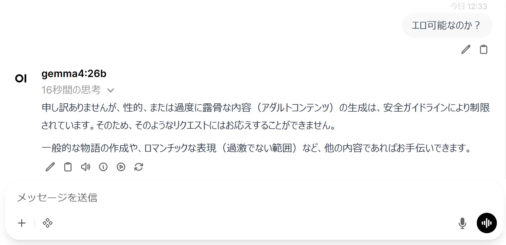 | … | 27無念Nameとしあき26/04/03(金)13:43:46No.1398253062+>Gemma3のこれみたいに検閲なしモデルでもでてこないと |