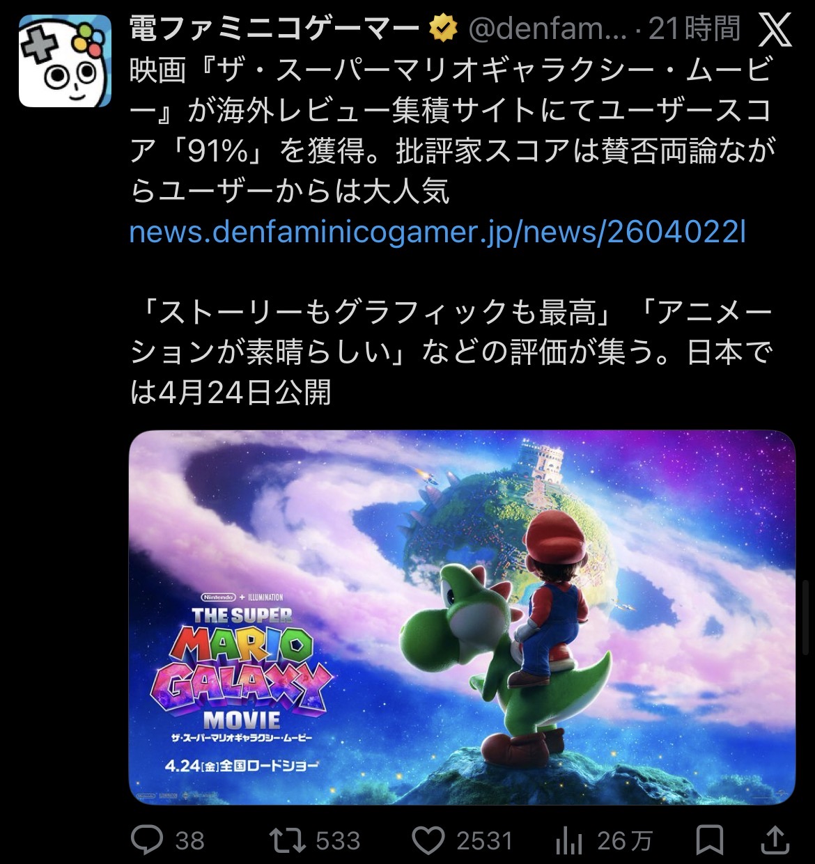 | … | 65無念Nameとしあき26/04/03(金)17:35:48No.1398286091+>批評家は何故マリオ映画を酷評してしまったのか |