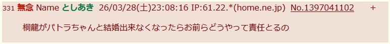 | … | 34無念Nameとしあき26/04/03(金)23:33:03 IP:118.108.*(mesh.ad.jp)No.1398380403+ついに糖尿病で入院したのか智昭 |