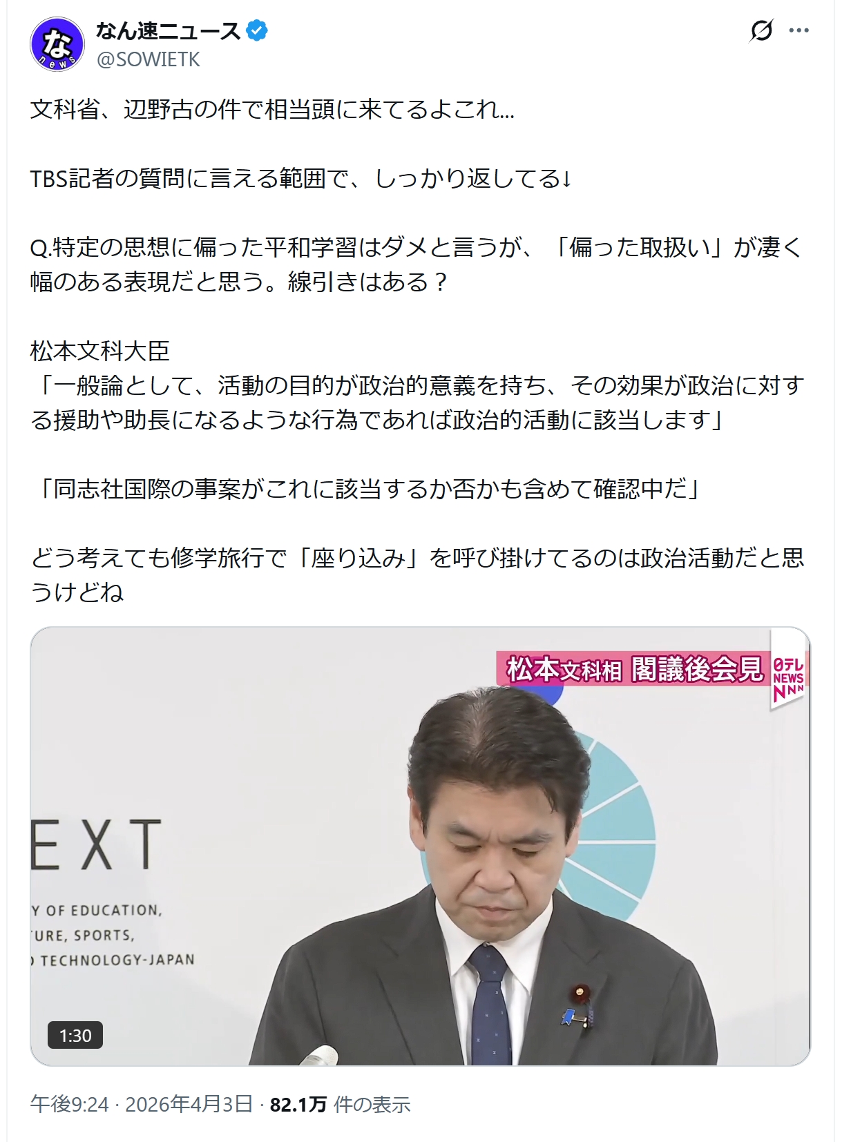 | … | 82無念Nameとしあき26/04/04(土)15:18:46No.1398501060そうだねx3学校を挙げて左翼活動とか校長や理事長を引責辞任レベルの愚行でしょ |