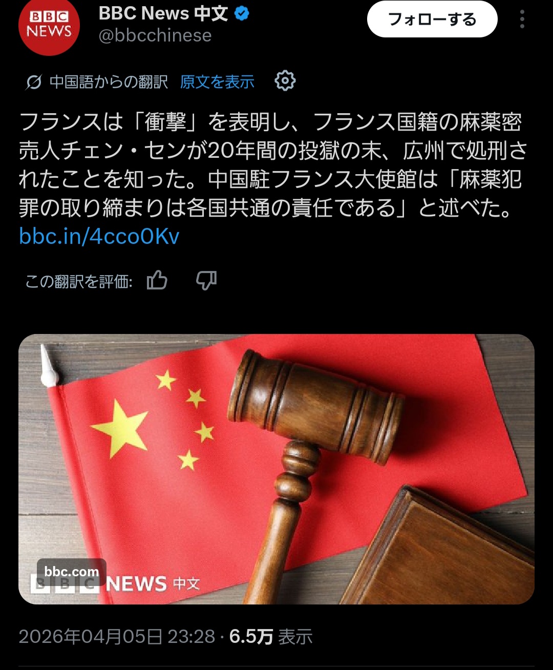 | … | 30無念Nameとしあき26/04/06(月)09:16:56No.1398943729そうだねx6>中国でフランス人か死刑執行に |