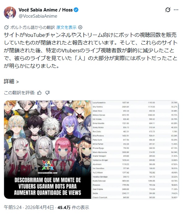 | … | 1無念Nameとしあき26/04/06(月)09:04:30No.1398942627そうだねx14 1775433870897.jpg-(149852 B) YouTubeチャンネルやストリーム向けにボットの視聴回数を販売していたサイトが閉鎖されたと報告されています。そして、これらのサイトが閉鎖された後、特定のVtubersのライブ視聴者数が劇的に減少したことで、彼らのライブを見ていた「人」の大部分が実際にはボットだったことが明らかになりました。 |