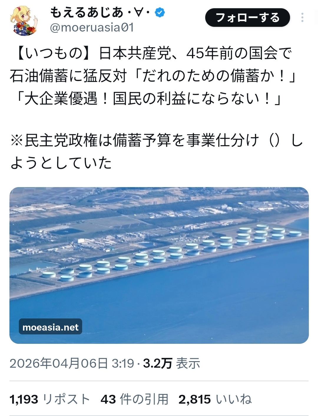| … | 11無念Nameとしあき26/04/06(月)10:39:39No.1398952869そうだねx13石油備蓄にも反対するし |