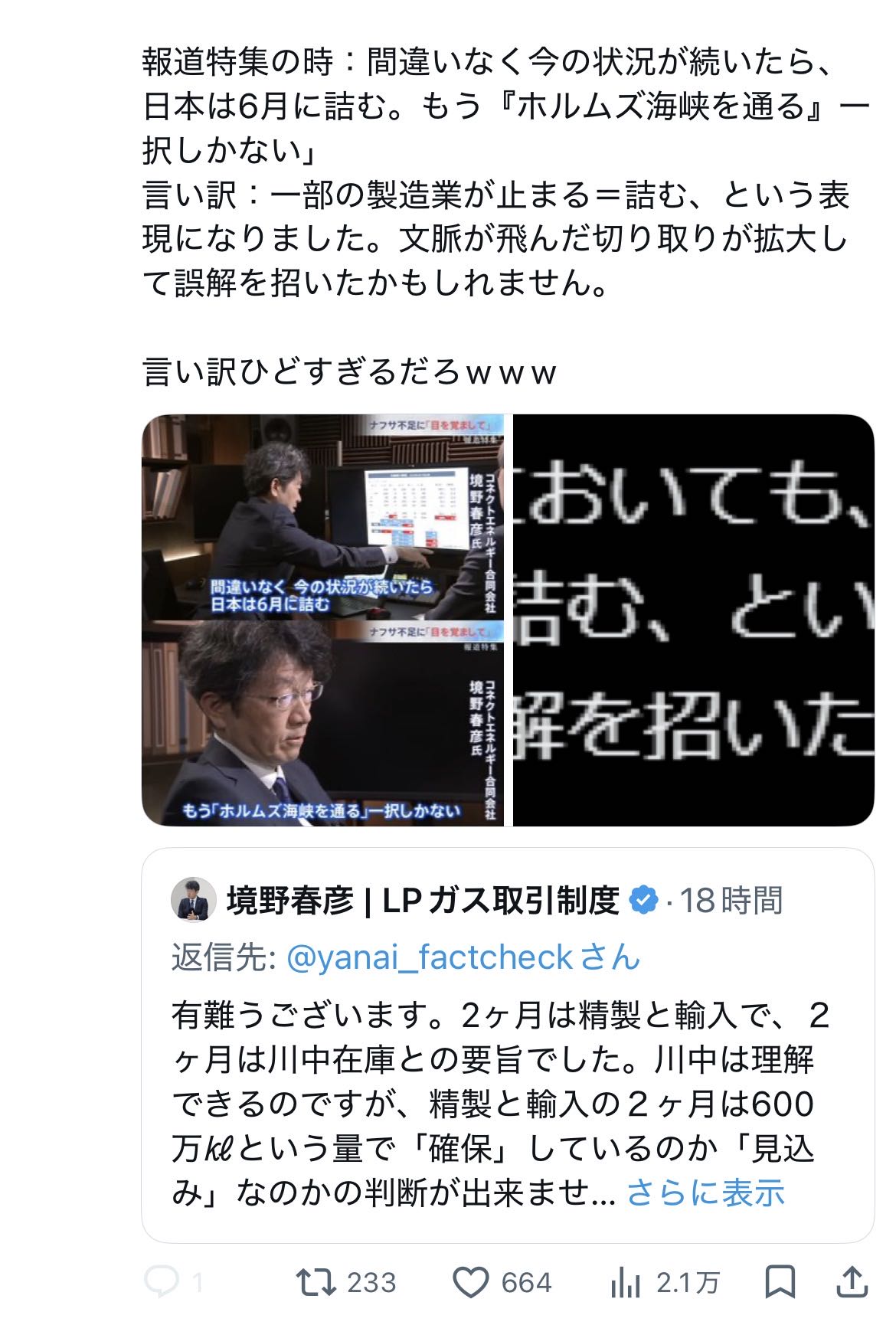 | … | 8無念Nameとしあき26/04/06(月)17:04:31No.1399010613そうだねx5>輸入してたナフサの半分以上がホルムズ海峡通ってたわけでそこから輸入できなくなるとナフサが不足するのは当たり前の事なのに「ナフサが不足するなんてデマだ」って叩いてる人達は何なんだろって思う |