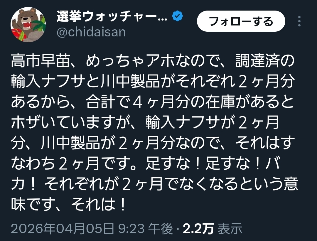 | … | 280無念Nameとしあき26/04/06(月)18:02:13No.1399020471+本日の記者会見でナフサが足りないと言う左翼陣営に |