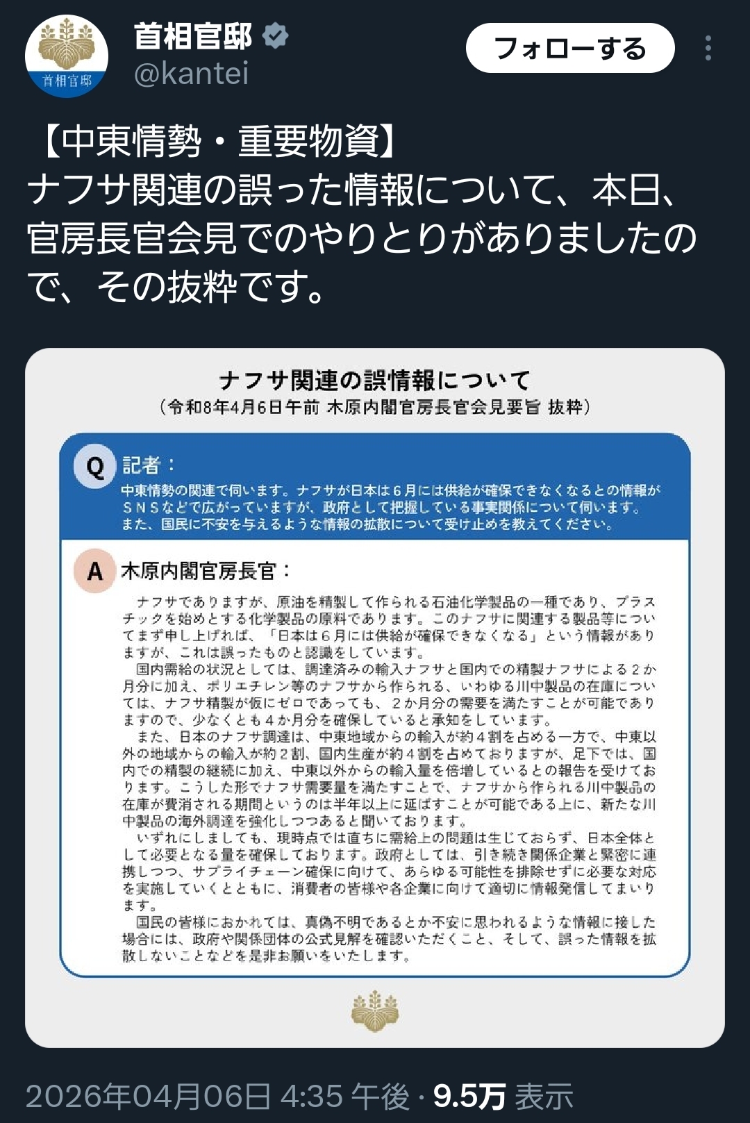 | … | 9無念Nameとしあき26/04/06(月)17:05:04No.1399010704そうだねx3 1775462704730.jpg-(93383 B) ナフサ供給不足の情報否定 官房長官、政府見解確認を |