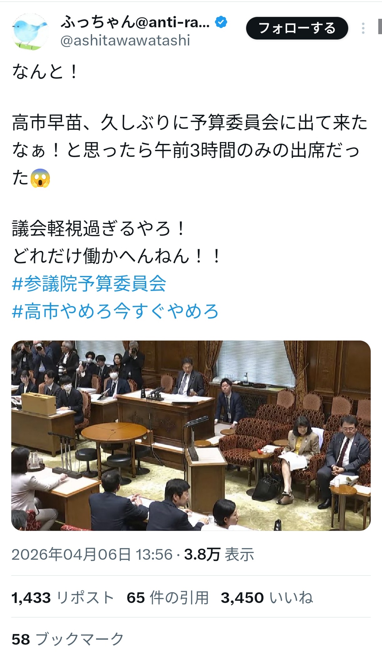| … | 68無念Nameとしあき26/04/06(月)17:14:58No.1399012308そうだねx8 1775463298196.jpg-(104503 B) >高市叩きは楽しいですか? |