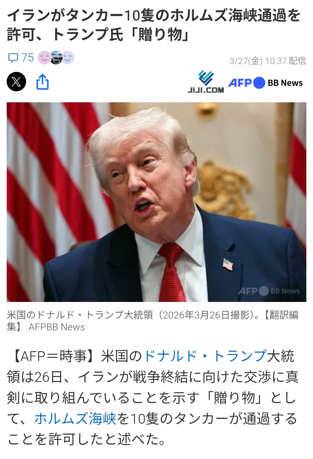 | … | 220無念Nameとしあき26/04/07(火)16:20:06No.1399211030そうだねx1>同筋によると、イランは先週、パキスタンの仲介で米国と合意に達し、両船のホルムズ海峡通過を認めていた。両船がホルムズ海峡を通過していれば、イラン戦争開始後初めてのLNG貨物の海峡通過となるはずだった。 |