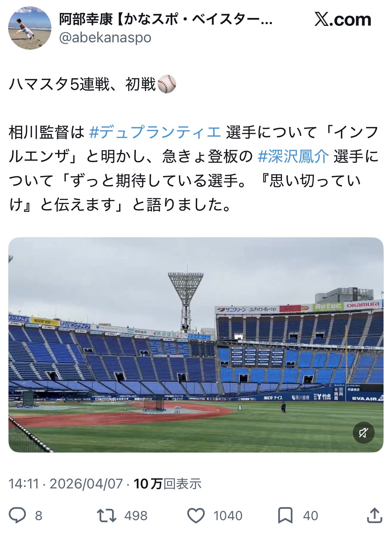 | … | 37無念Nameとしあき26/04/07(火)15:04:26 ID:WazpCzpYNo.1399199883そうだねx3相川監督は #デュプランティエ 選手について「インフルエンザ」と明かし、急きょ登板の #深沢鳳介 選手について |
