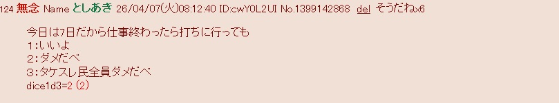 | … | 6無念Nameとしあき26/04/07(火)14:59:36 ID:hyz/88DUNo.1399199181+今日はノーガードの殴り合いデース |