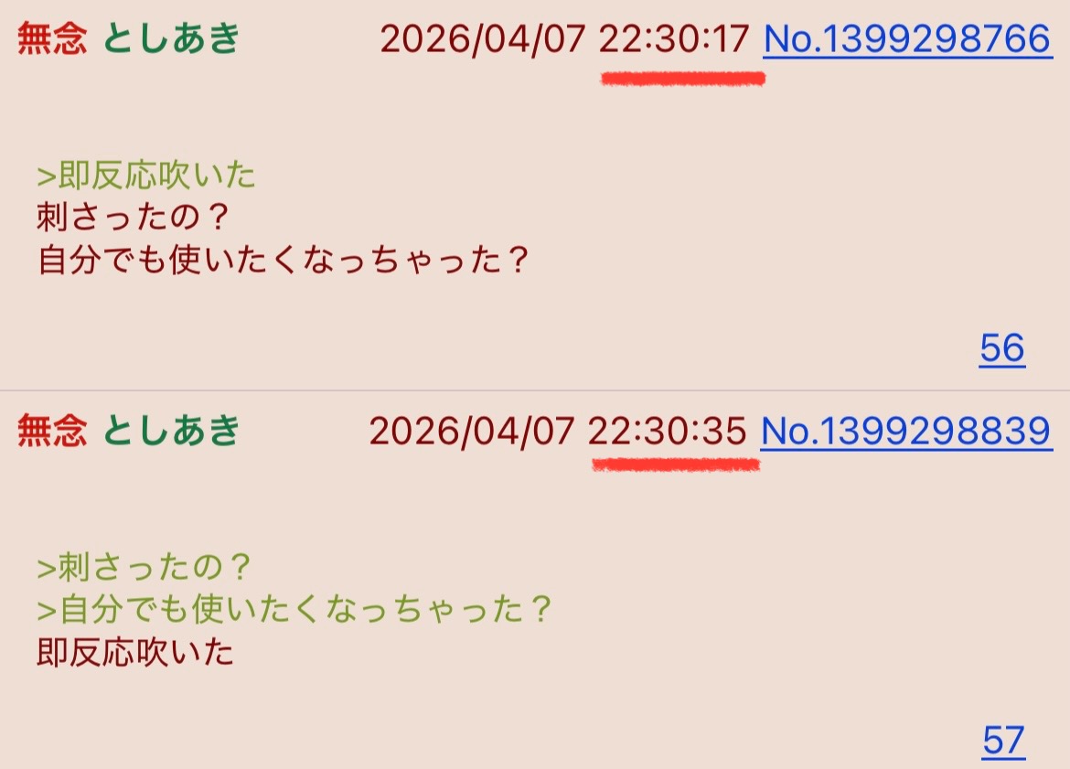 | … | 57無念Nameとしあき26/04/07(火)22:30:35No.1399298839+>刺さったの? |