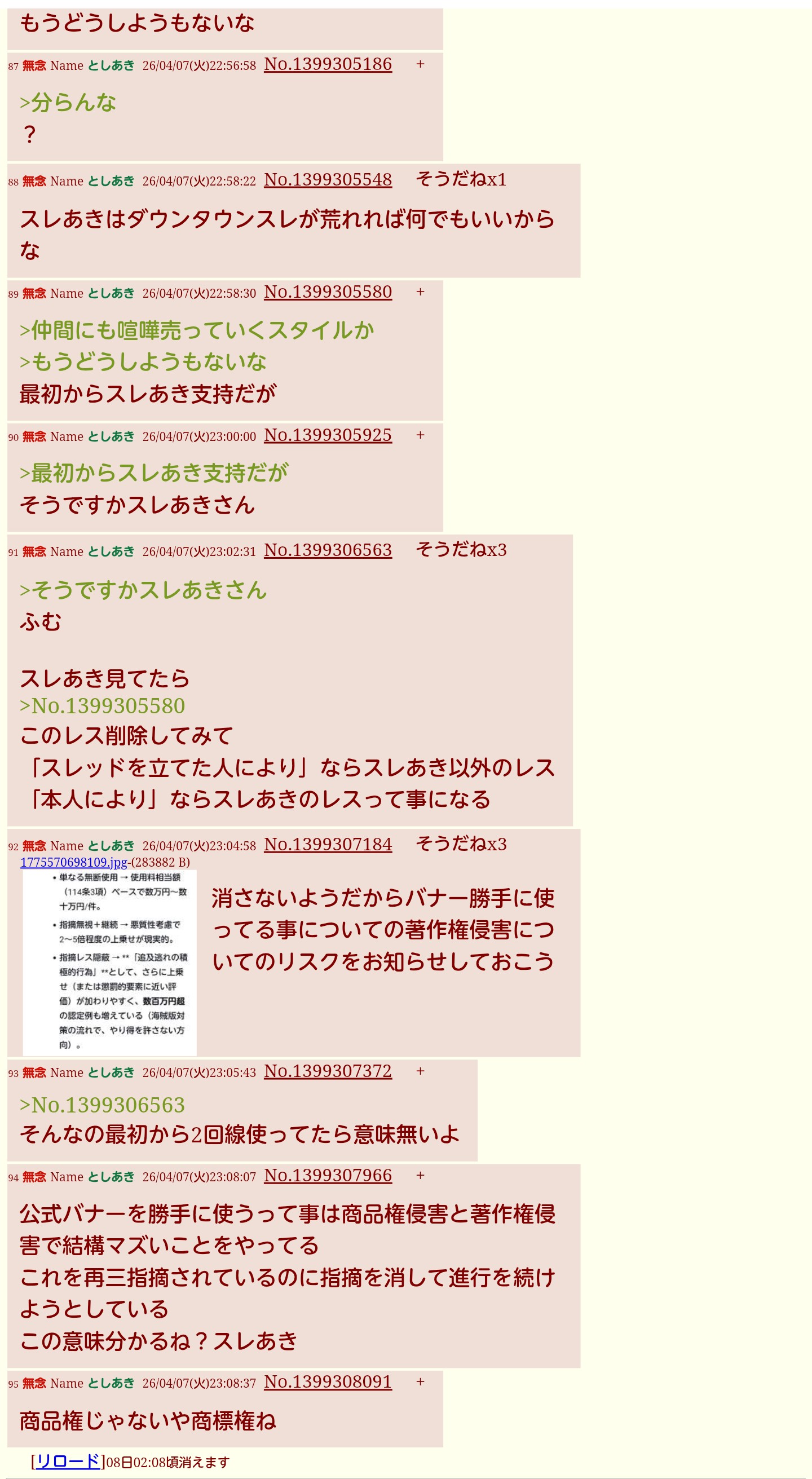 | … | 98無念Nameとしあき26/04/07(火)23:15:37No.1399309686+>消さないようだからバナー勝手に使ってる事についての著作権侵害についてのリスクをお知らせしておこう |