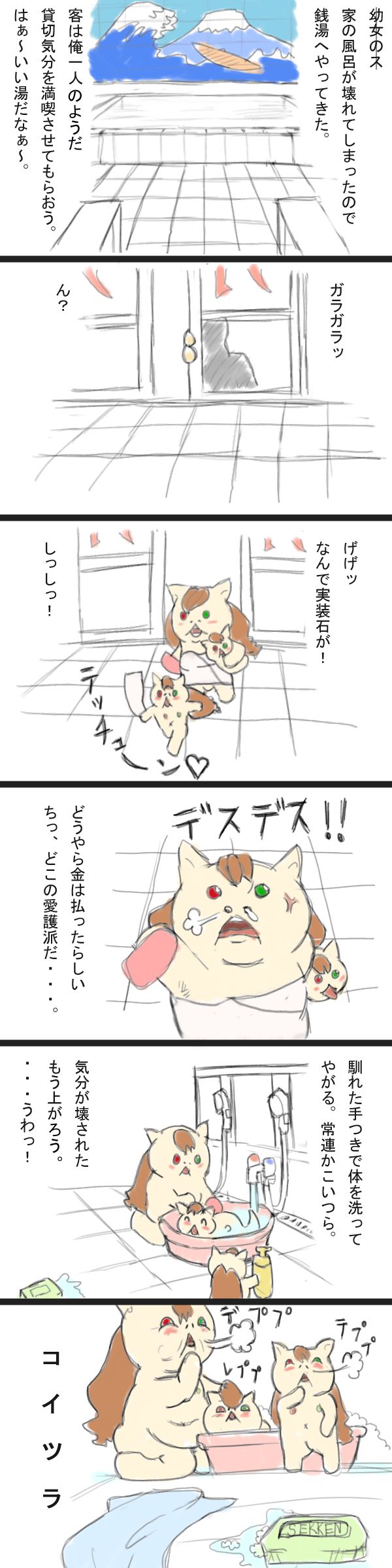 | … | 25無念Nameとしあき26/04/08(水)00:50:29 ID:05kS92YMNo.1399328302+お風呂関係の作品だと銭湯に行ったら実装親仔が入ってきて色々あって虐待するんデスが仔をやられた母蟲が「器物破損で訴えてやるデズゥ!」とのたまうやつが好きだったデスン |