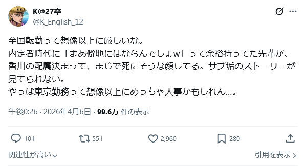 | … | 46無念Nameとしあき26/04/08(水)10:01:13No.1399369028+転勤にも二種類あって |