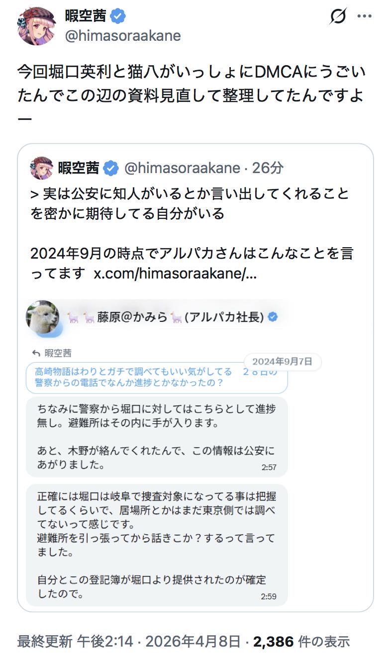 | … | 20🐼Nameとしあき26/04/08(水)12:41:10 IP:182.249.*(au-net.ne.jp)No.1399393760そうだねx9暇空が過去のDM掘り返せるくらいの時間を与えてくれた人ありがとう |