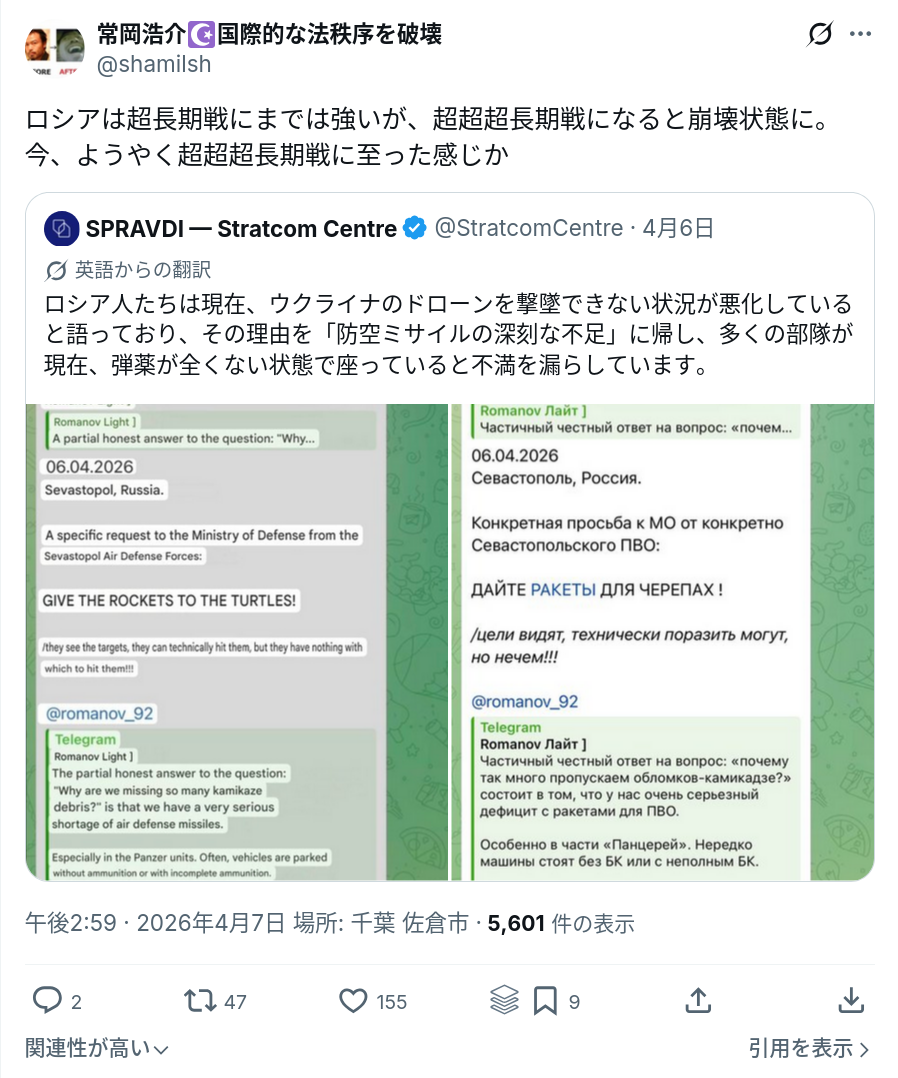 | … | 66無念Nameとしあき26/04/08(水)11:04:22No.1399378046+>イラン攻撃でイラン製のドローンやら武器が調達できなくてロシア困ってんのに |