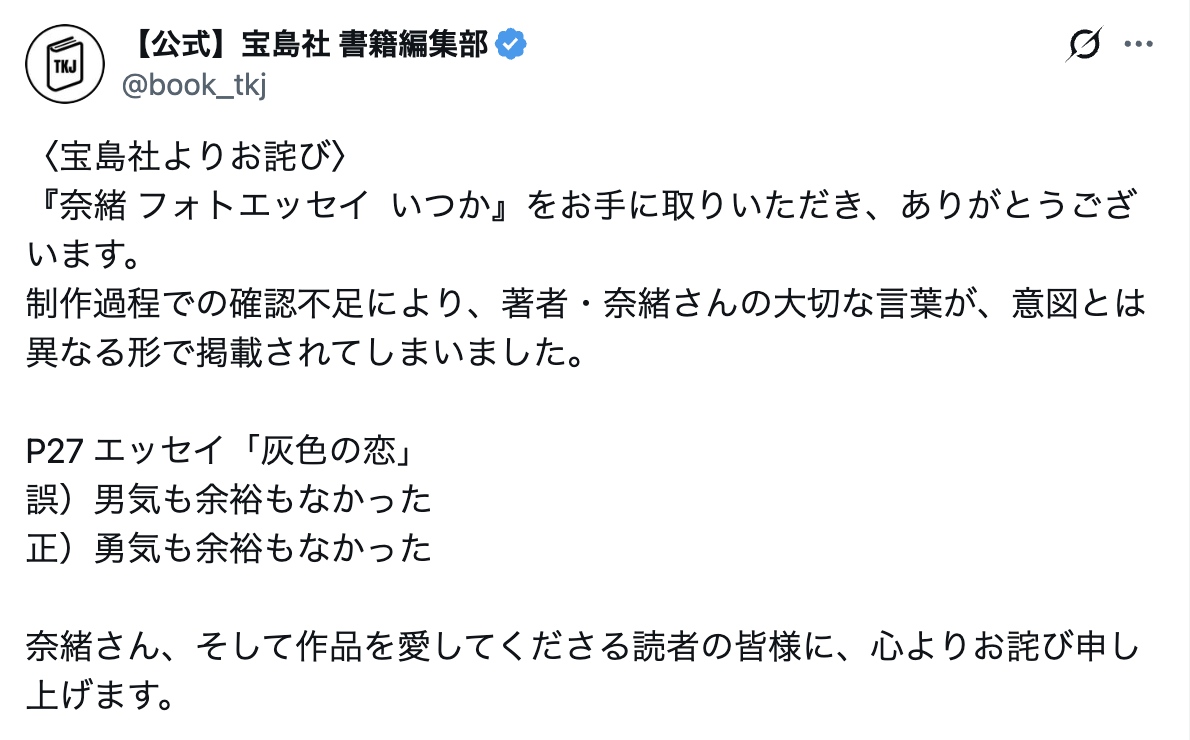 人気タレントフォトエッセイ誤植で制作謝罪