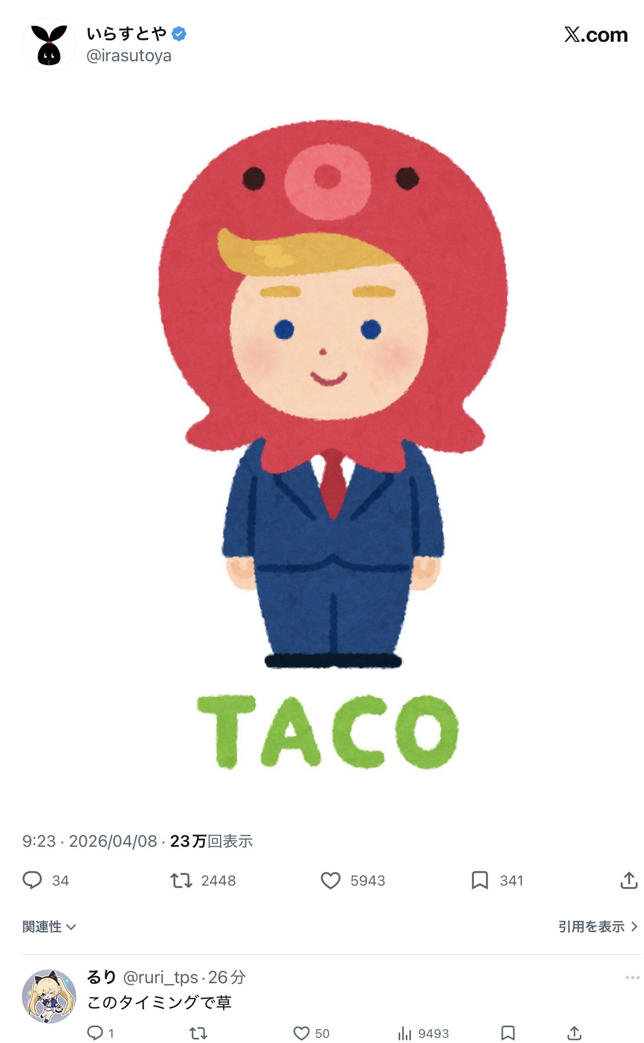 | … | 11無念Nameとしあき26/04/08(水)21:52:25No.1399506090+TACOでタコだなんて日本人しか伝わらないだろ |