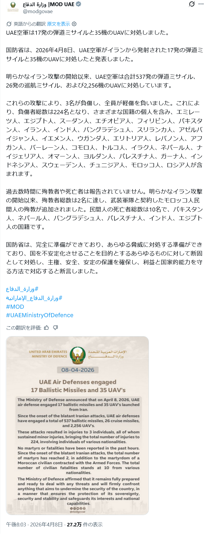 | … | 19無念Nameとしあき26/04/08(水)22:41:35No.1399519493+ 1775655695908.png-(555912 B) UAEには色んなものが飛んできて |