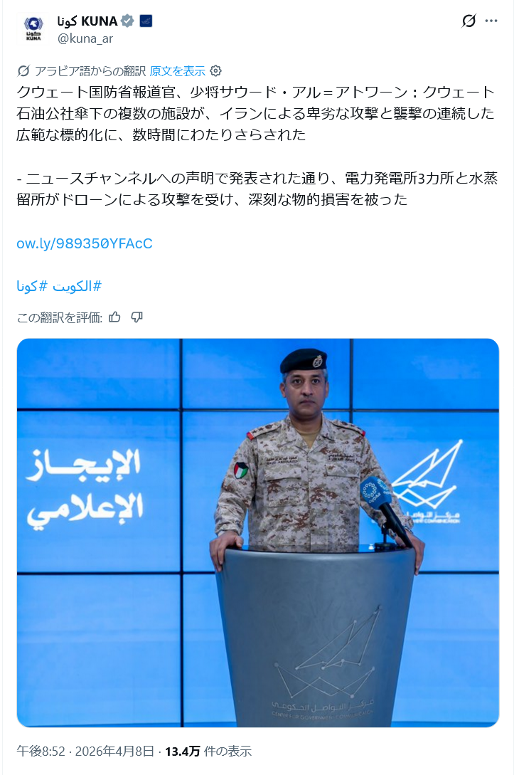 | … | 20無念Nameとしあき26/04/08(水)22:42:40No.1399519808+ 1775655760817.png-(657716 B) クウェートのインフラは攻撃され |