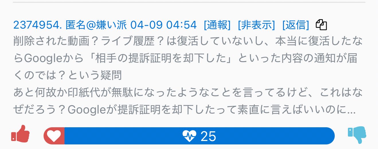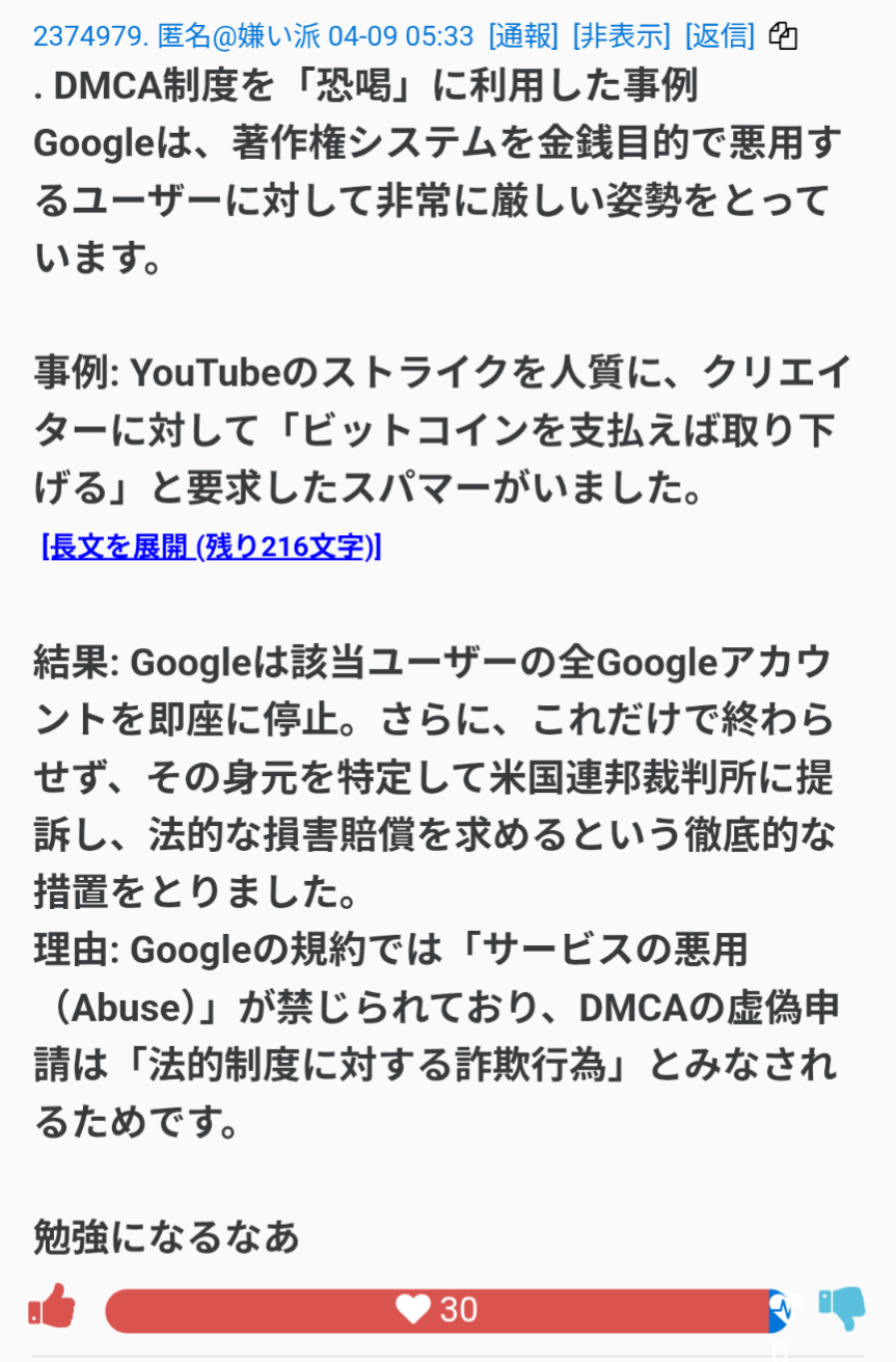 | … | 29無念Nameパンダ26/04/09(木)09:56:51 IP:106.155.*(au-net.ne.jp)No.1399581017そうだねx3グーグル告発サイトの公開が待たれる |