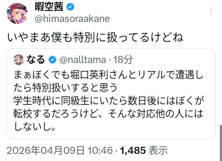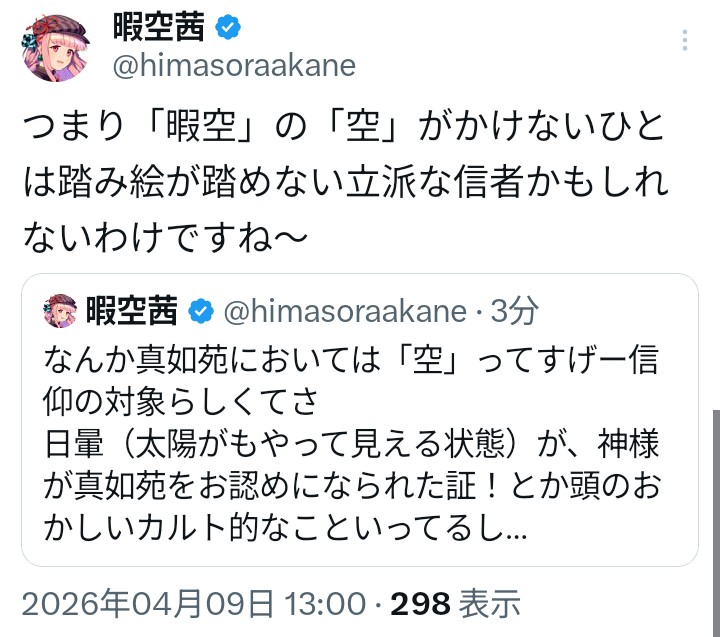 | … | 116無念Name🐼26/04/09(木)13:43:26 IP:126.157.*(openmobile.ne.jp)No.1399616319+ひらがなにはひらがなで意味持たせてそうだし都知事選のひまそらあかね表記での立候補結果的にとんでもない手だったのでは…? |