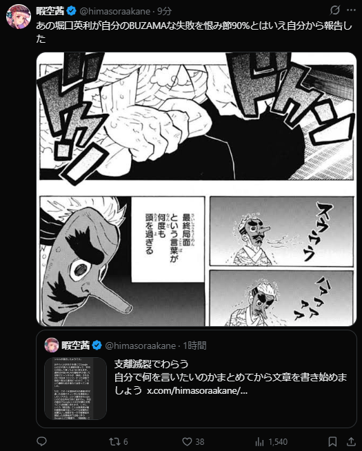 | … | 115無念Name🐼26/04/09(木)13:41:44 IP:153.173.*(ocn.ne.jp)No.1399616072そうだねx1ヒマゾラ呼びは安倍さんの事をアベとか書くみたいに気に食わない相手は名前を正しく書く事すら忌避してる程度にしか考えてなかった… |
