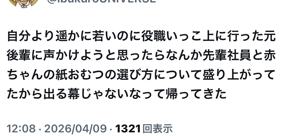 | … | 26無念Nameとしあき26/04/09(木)09:49:12 IP:126.233.*(openmobile.ne.jp)No.1399580072そうだねx22このスレも大半はサボリーマンだからなぁ |