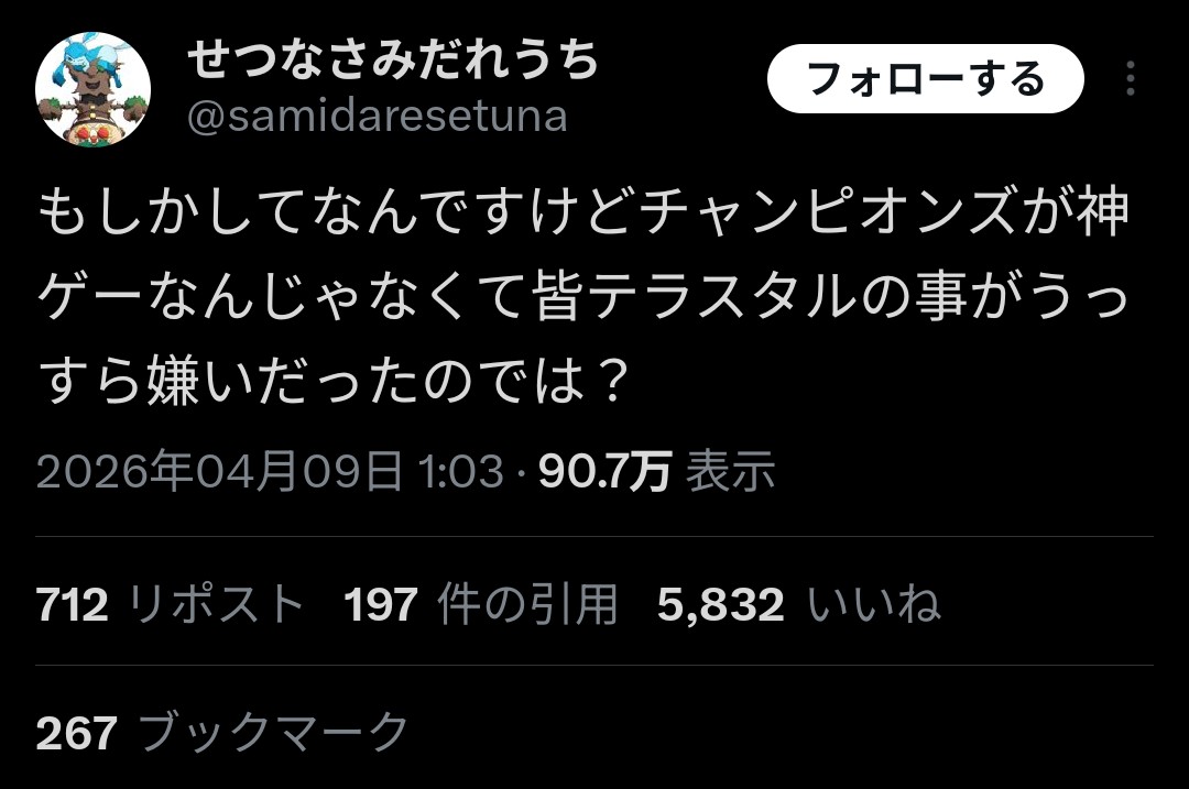 | … | 88無念Nameとしあき26/04/09(木)18:55:16No.1399665163そうだねx2>スレで話題になってるポケモンブリジュラスしかいないな |