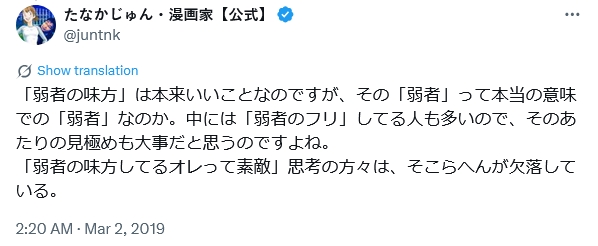| … | 58無念Nameとしあき26/04/09(木)19:00:42No.1399666433そうだねx9 1775728842720.jpg-(79834 B) たなかじゅん「弱者のフリしてるやつを助ける必要なくない?」 |