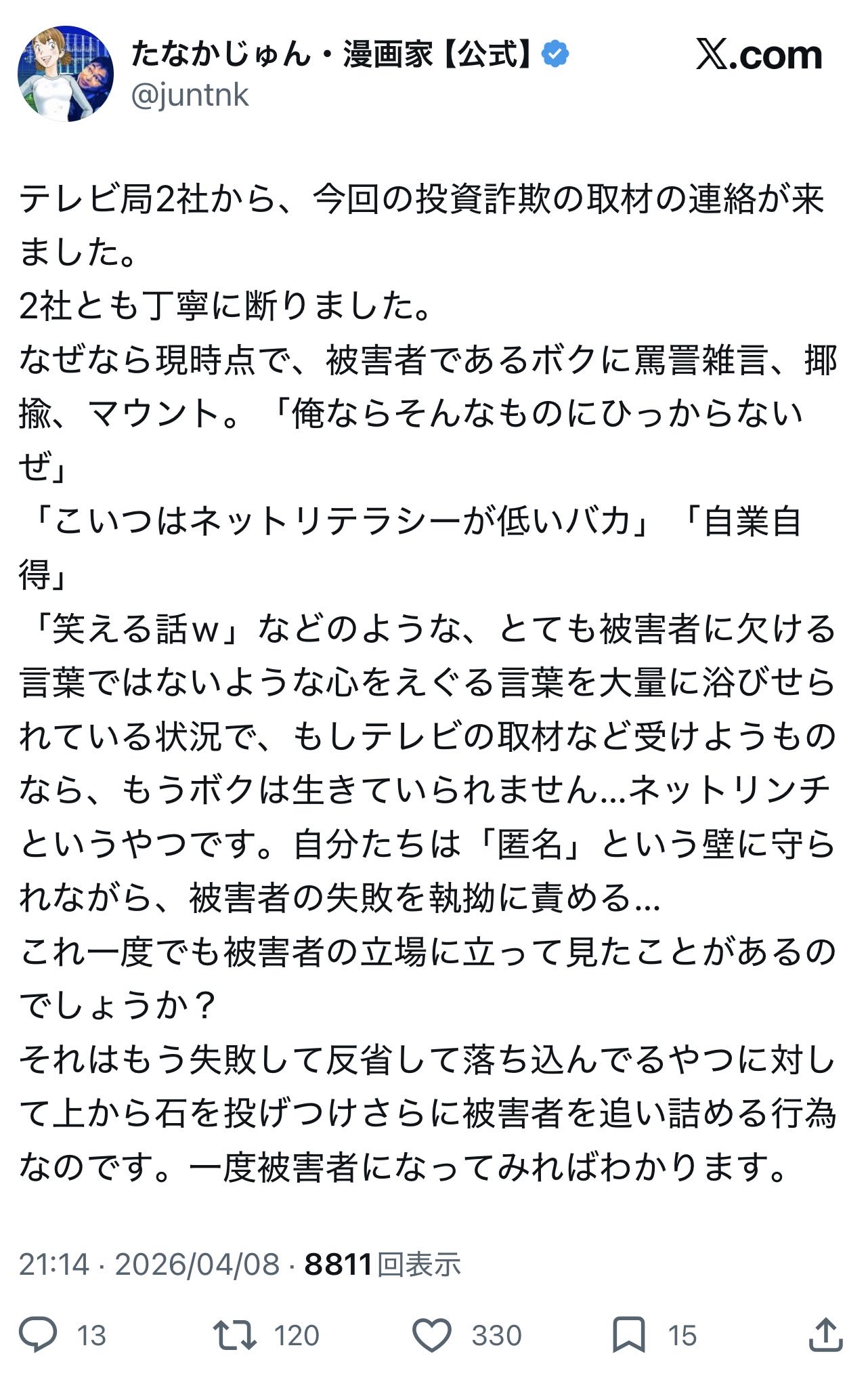 | … | 143無念Nameとしあき26/04/09(木)19:48:08No.1399678048+>本当に巧妙な手口の詐欺だったら同情されてたと思う |