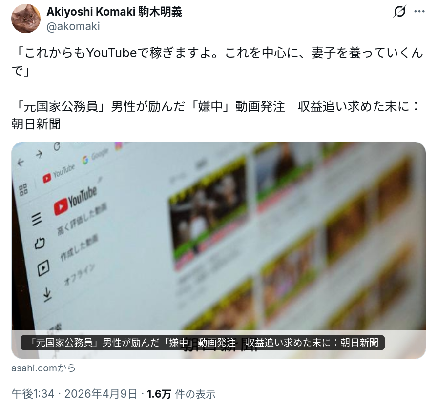 | … | 36無念Nameとしあき26/04/09(木)19:01:17No.1399666591+>排外主義や差別思想で金儲けできてしまうシステムが歪んでる |