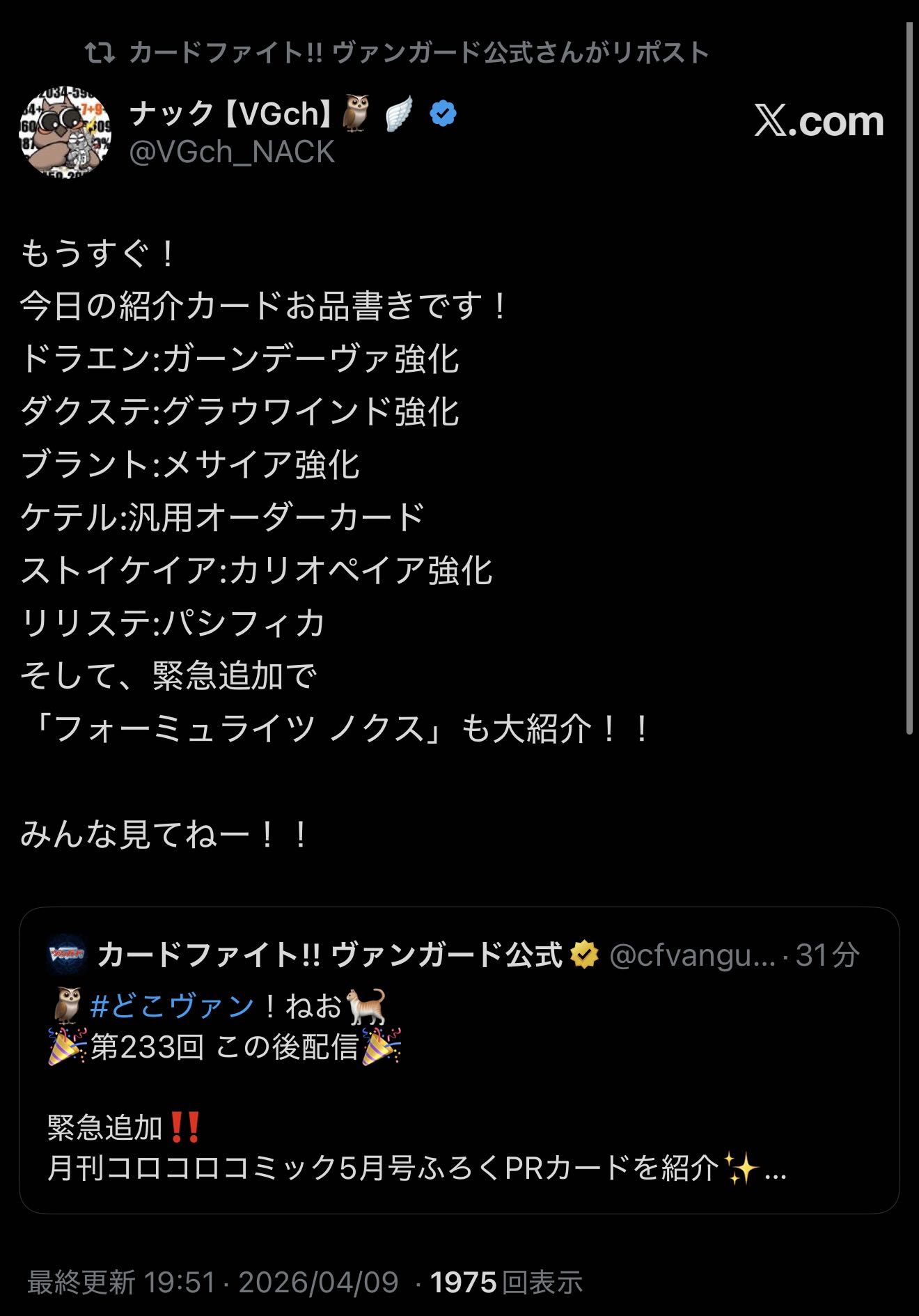 | … | 53無念Nameとしあき26/04/09(木)21:01:50No.1399699278+>https://x.com/cfvanguard_PR/status/2042165624500081011 |