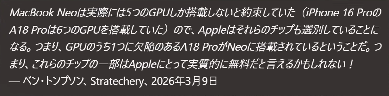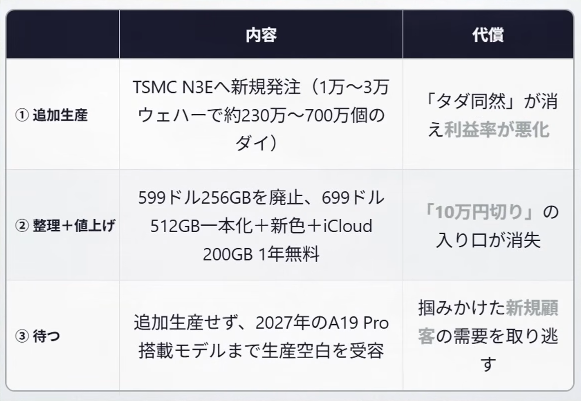 当初Appleの計画では1年は確実に保つはずで、2027年にはiPhone17Proのビニング品をNeo2に使用する予定だったが売れすぎたために1年持たない可能性が濃厚になってしまったからだ