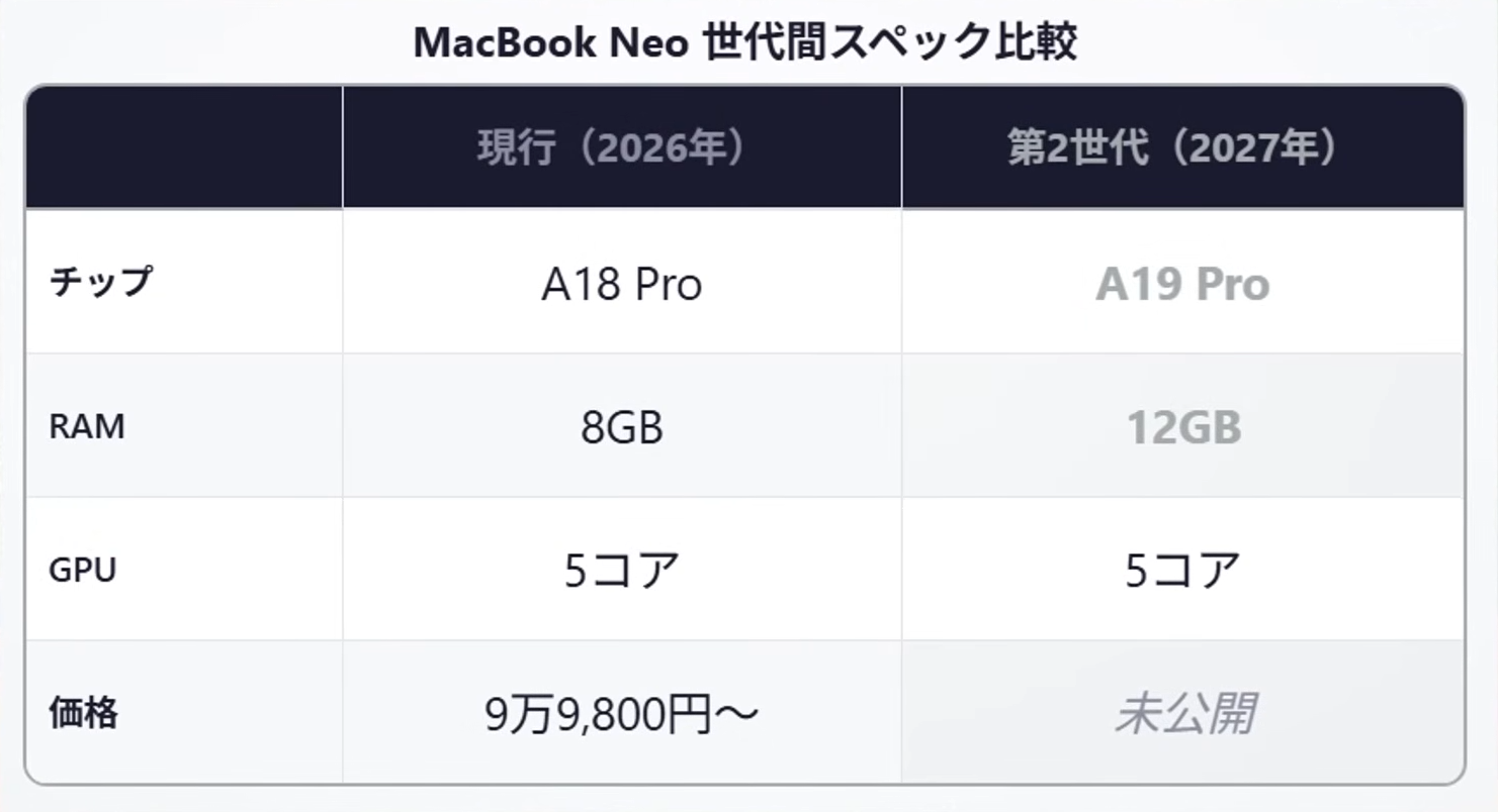 | … | 5無念Nameとしあき26/04/09(木)21:32:25No.1399708328+ 1775737945954.png-(289065 B) ちなみに来年予定のNeo2だがメモリは12GBに拡張するがGPUはNeo初代と同じでビニング品なので-1コアとなりGPU性能は横滑りとなる |