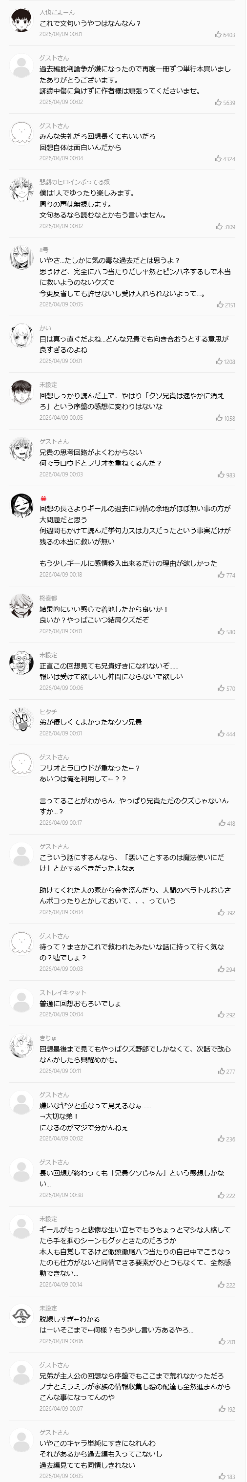 | … | 32無念Nameとしあき26/04/09(木)23:43:30No.1399740301+回想で伝わってきたことが兄貴がクズってだけなんだけど |