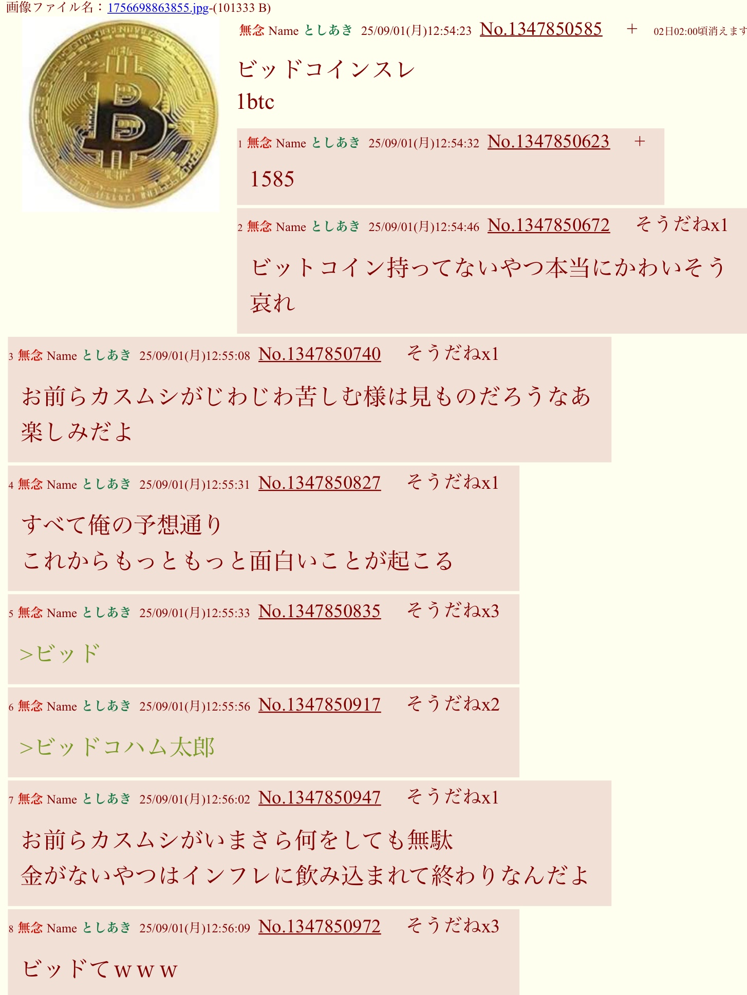 | … | 97無念Nameとしあき26/04/10(金)08:35:42No.1399777257+株持ってるやつは負け組だとビットコインスレで吠えまくってるのにそれすら一貫性がないのか… |