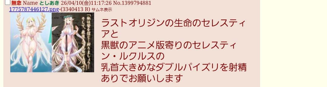 | … | 30無念Nameとしあき26/04/10(金)13:00:31No.1399812885+>乳首大きめなダブルパイズリを射精ありでお願いしますってなんかジワジワくるぬ |
