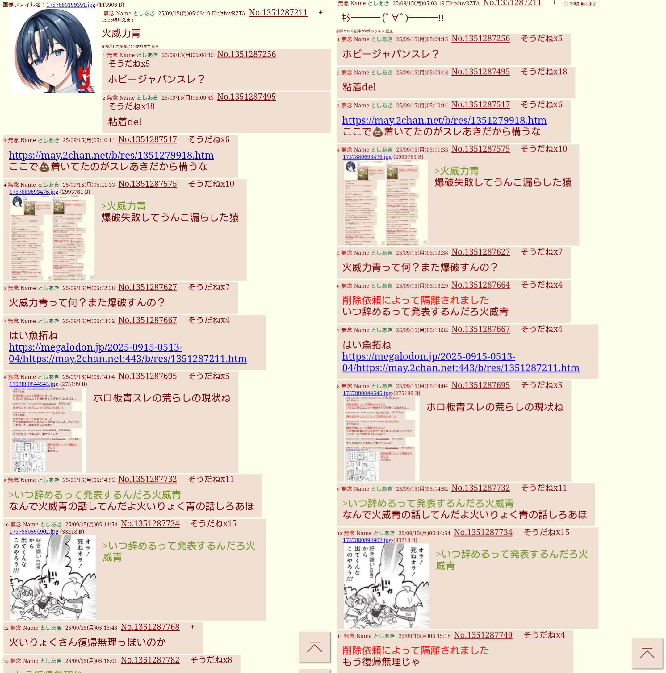 | … | 312無念Nameとしあき26/04/10(金)19:31:47No.1399881344そうだねx4こうやってアンチが異常だからそれを叩いてるだけとか言ってもホロライブを捏造叩きしてる奴はスルーしてるんだからただのホロアンだってバレるのに… |