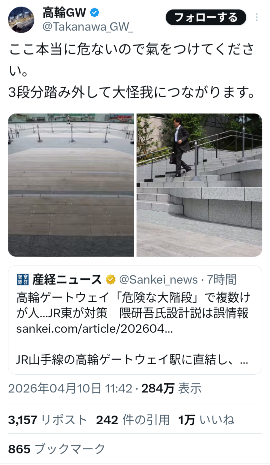 | … | 39無念Nameとしあき26/04/10(金)20:04:14No.1399889428+>わざと踏み外してケガしたら賠償とれそうだな |