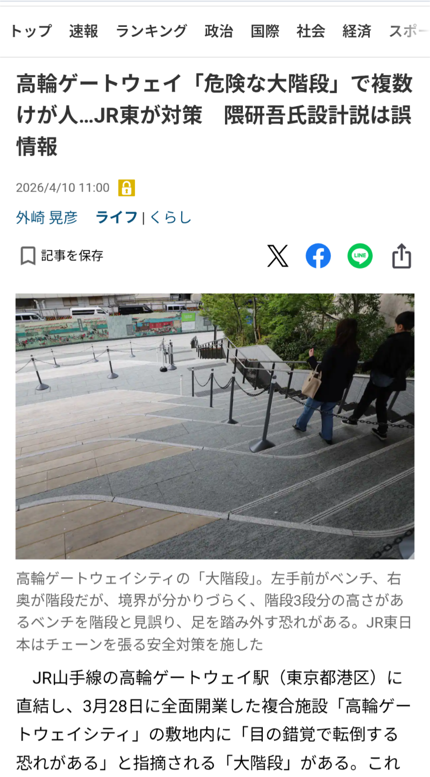 | … | 55無念Nameとしあき26/04/10(金)20:28:15No.1399895923そうだねx3>他方、SNS上ではこの設備が著名建築家の隈研吾氏の設計だとする誤った情報が拡散しているが、JR東側、隈氏側双方が否定した。 |