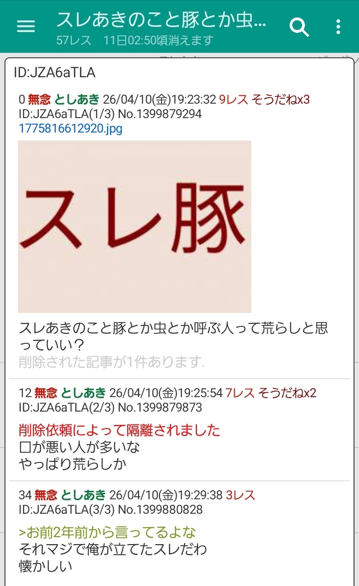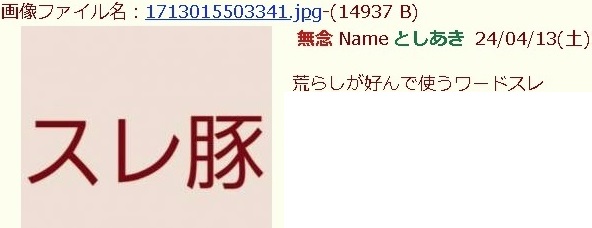 | … | 82無念Nameとしあき26/04/10(金)20:49:47No.1399902088+>スレあきのこと豚とか虫とか呼ぶ人って荒らしと思っていい? |