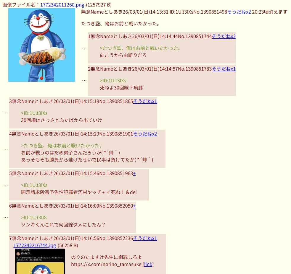 | … | 83無念Nameとしあき26/04/10(金)20:51:14No.1399902483+>たつき粘着スレ立ててたのもスレ主? |