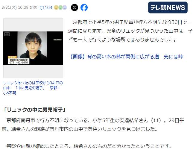 | … | 435無念Nameとしあき26/04/11(土)02:59:23No.1399978518+>シャベルで地面を掘り… 小6男児行方不明 50人態勢で市内全域を捜索 通学用かばん以外に有力な手がかりなし 京都・南丹市|TBS NEWS DIG |