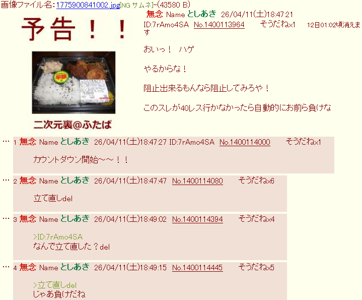 | … | 20無念Nameとしあき26/04/11(土)18:54:28No.1400115711そうだねx5>>このスレが40レス行かなかったら自動的にお前ら負けな |