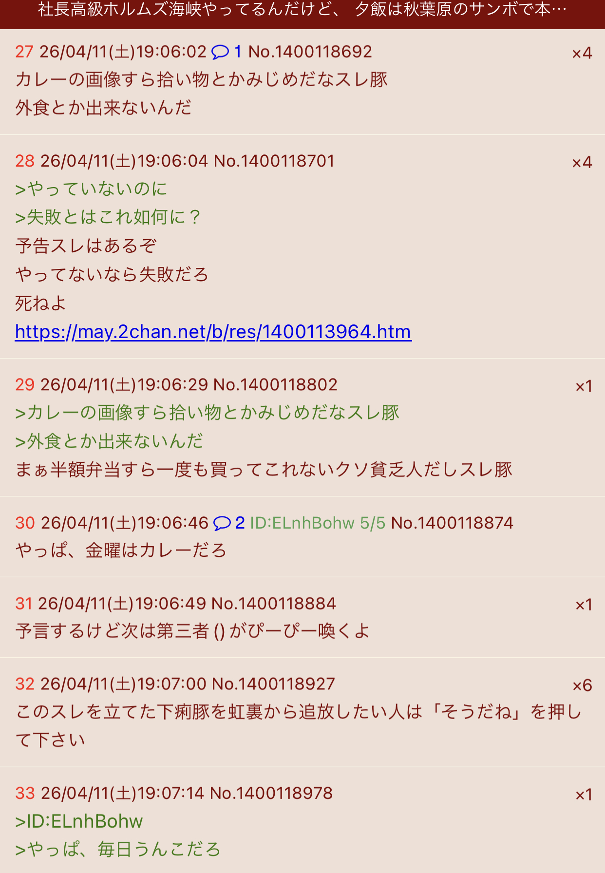 | … | 37無念Nameとしあき26/04/11(土)18:57:53No.1400116569+また無意味で無駄な弁当予告()してるのか… |
