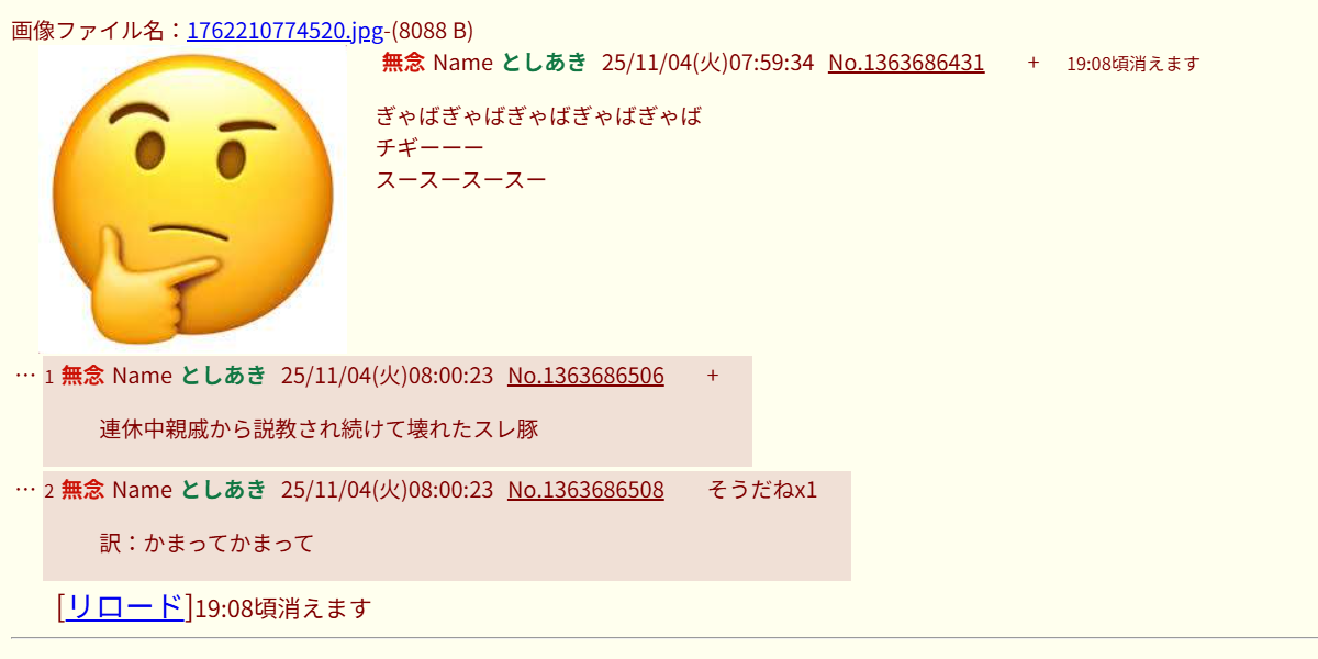 | … | 73無念Nameとしあき26/04/12(日)12:44:51No.1400303864+一回ブヒッと鳴く都度新しいクソスレを立てないで |
